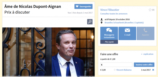 L’Âme de Nicolas Dupont Aignan vendue aux enchères sur internet. Départ: 1 euro
