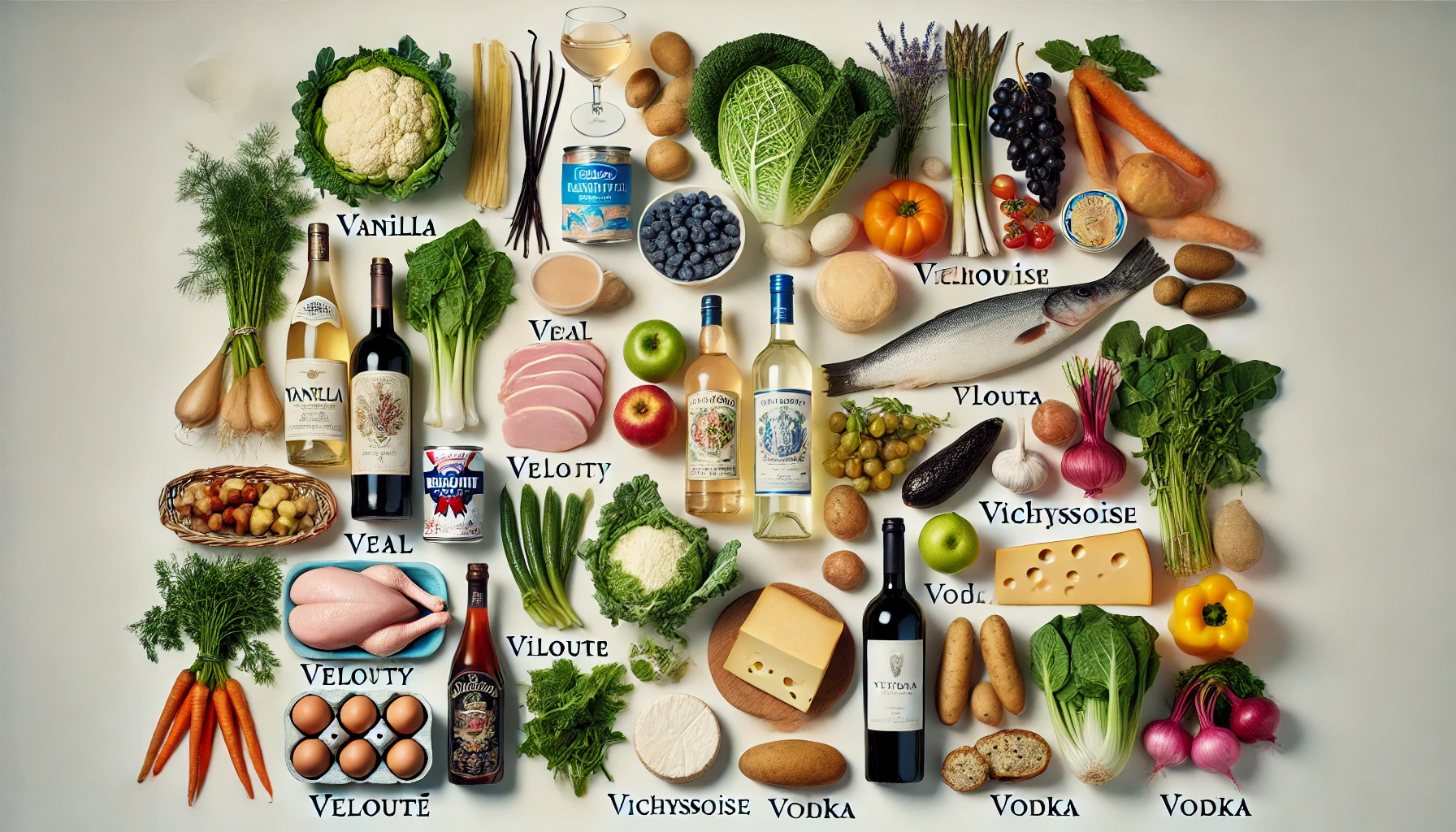 DALL·E 2024-08-07 19.24.27 – A variety of foods starting with the letter ‘V’ arranged on a white countertop. Includes vanilla, veal, poultry, vague fish, velouté, vichyssoise, win